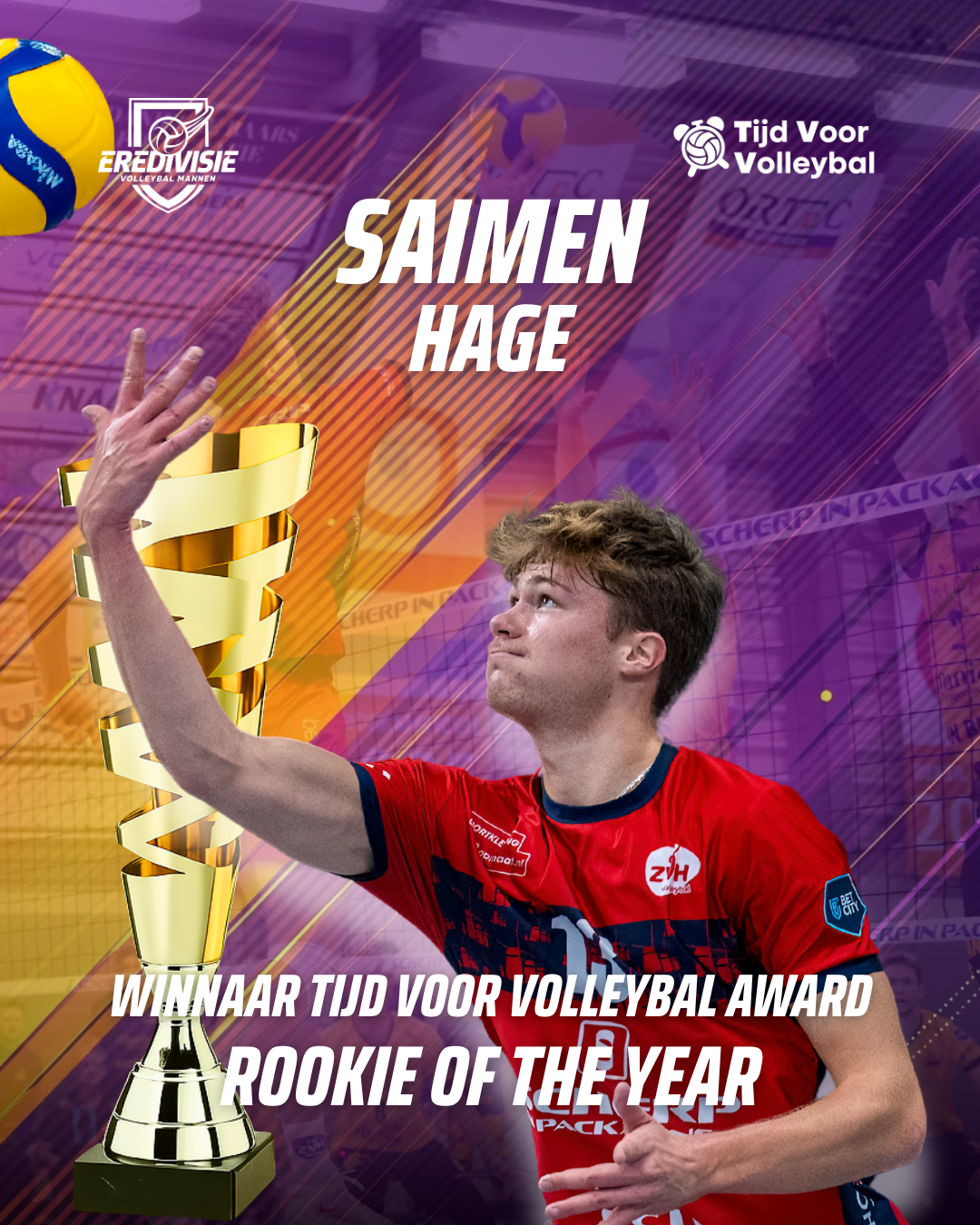 Saimen Hage (20) speelde dit seizoen voor Scherp in Packaging Zevenhuizen. De talentvolle passer-loper startte op zijn 16e in de Eredivisie bij het Talentteam en ontwikkelde zich dit jaar tot een dragende kracht bij Zevenhuizen. Volgens zijn coach Rodin Merx maakte hij letterlijk en figuurlijk “enorme sprongen”. Dat resulteerde in een transfer naar topclub Knack Roeselare in België, waarmee hij volgend seizoen ook in de Champions League zal spelen.