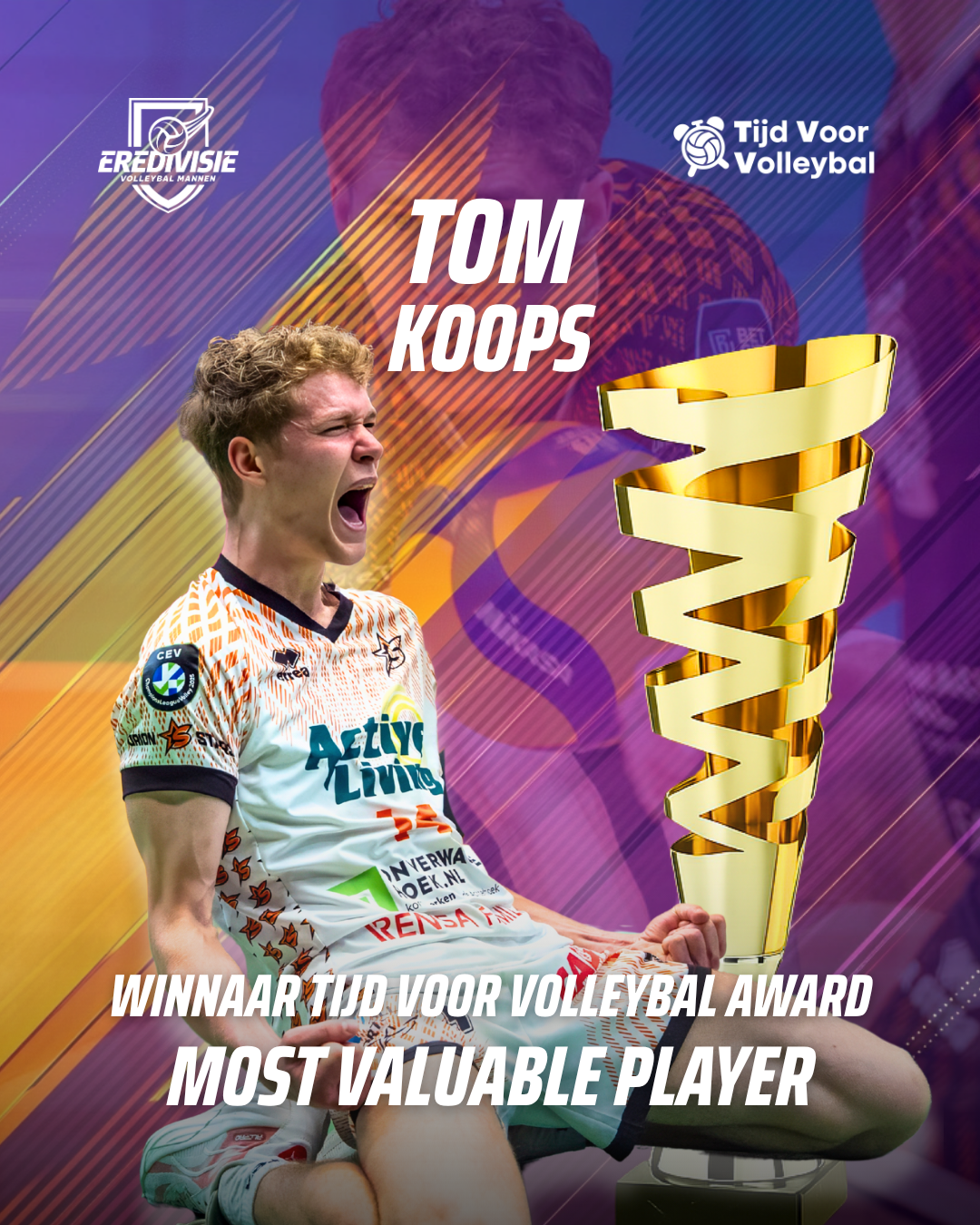 “Tom Koops heeft door zijn manier van spelen een bijdrage geleverd waar je niet omheen kunt,” zei Arno van Solkema, coach van Prima Donna Kaas Huizen. “Zowel serverend, passend, verdedigend als aanvallend bracht hij enorm veel energie. De manier waarop hij voor zijn team belangrijk is geweest in bepaalde fases van het seizoen, maar vooral in de play off finale, gaf de doorslag.”