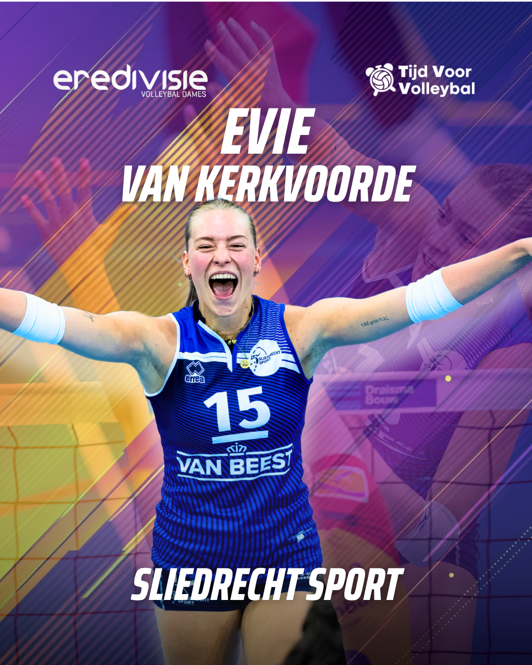 Passer-loper Evie van Kerkvoorde is al zes jaar een vertrouwd gezicht in de Eredivisie Dames. Na eerdere seizoenen bij Set-Up ’65 en Eurosped speelde ze dit jaar voor het derde seizoen op rij bij Sliedrecht Sport. Aanvallend was Van Kerkvoorde de meest dominante speelster van de competitie: ze scoorde regelmatig meer dan 25 punten per wedstrijd en werd op vrijwel elke positie gezocht door haar spelverdeelster. Ze leidde haar team naar de finale en bevestigde daarmee haar status als topspeelster.