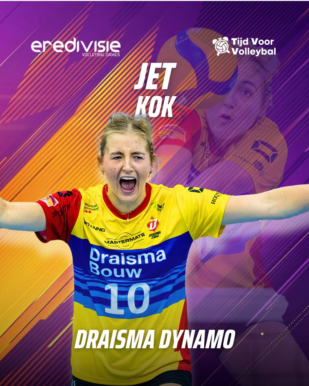 Jet Kok is pas 20 jaar oud, maar beschikt al over vier seizoenen ervaring op het hoogste niveau. Ze debuteerde in 2021 bij VCN en groeide dit seizoen uit tot de bepalende speelster van Draisma Dynamo, waarmee ze de Nationale Beker veroverde en de halve finale van de play-offs haalde. Als jongste speelster in deze top 4 is ze nét te oud voor de Award voor Rookie of the Year, maar ondanks haar jonge leeftijd was haar impact zo groot dat ze door de hoofdcoaches tot de beste spelers van het seizoen werd gerekend.