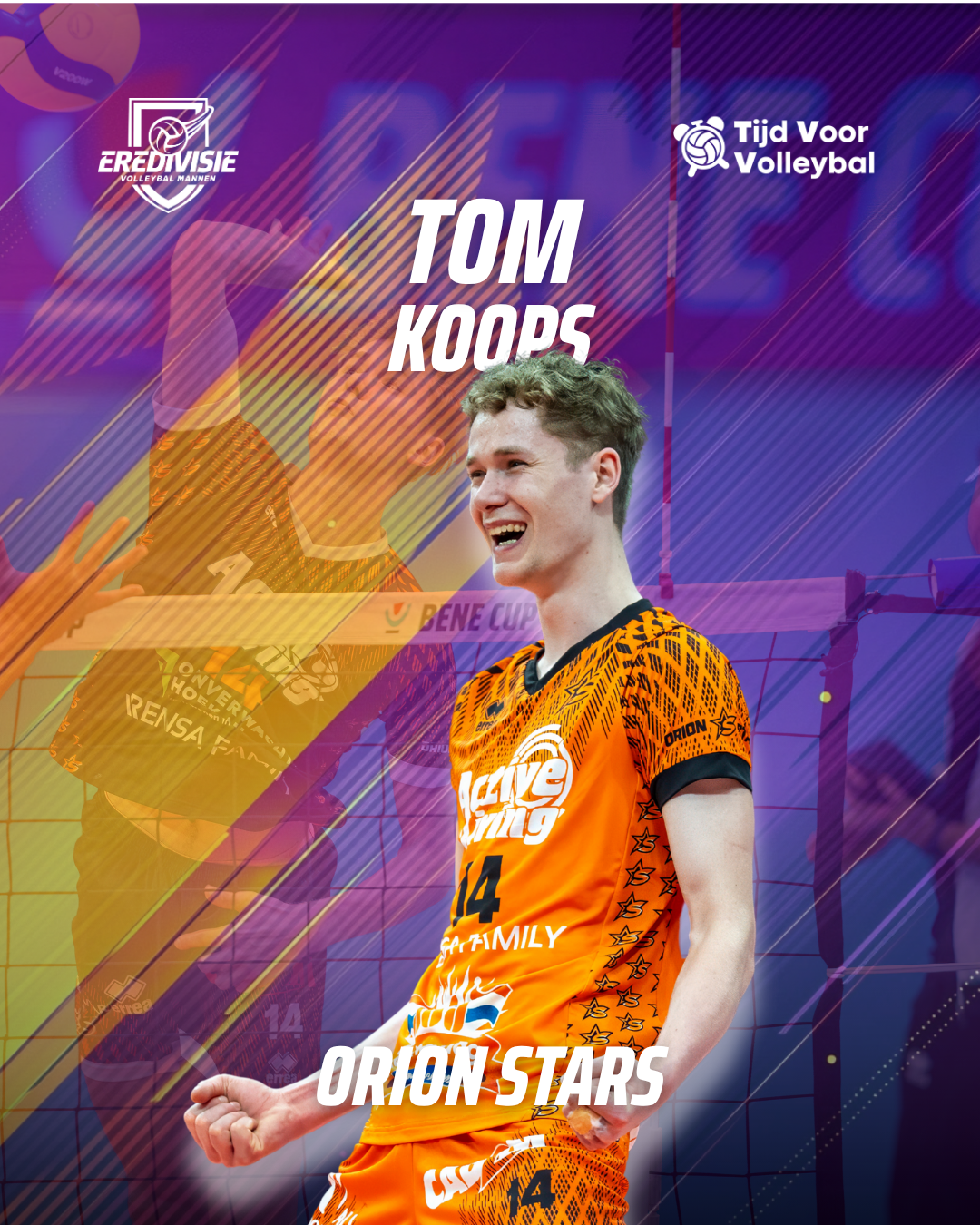Tom Koops was de sleutelspeler van Orion Stars. Dankzij zijn prestaties bereikte het team uit Doetinchem afgelopen twee jaar alle mogelijke finales – en won ze ook alle 5. De allround passer-loper leverde elke wedstrijd een constante bijdrage en groeide in de belangrijkste duels uit tot beslissende factor. In de eerste wedstrijd van de titelfinale werd hij topscoorder met 29 punten, en in de derde finalewedstrijd sloeg Koops bij 22-23 in de vijfde set de winnende bal binnen – het slotstuk van de meest spectaculaire wedstrijd van het seizoen.
